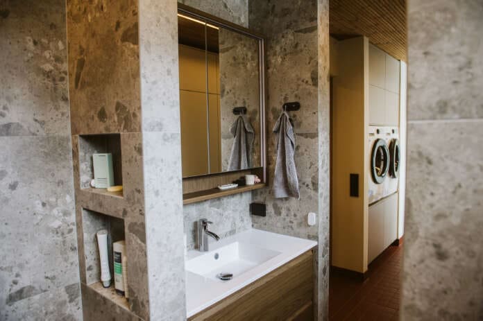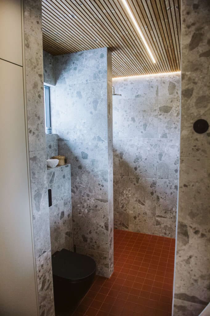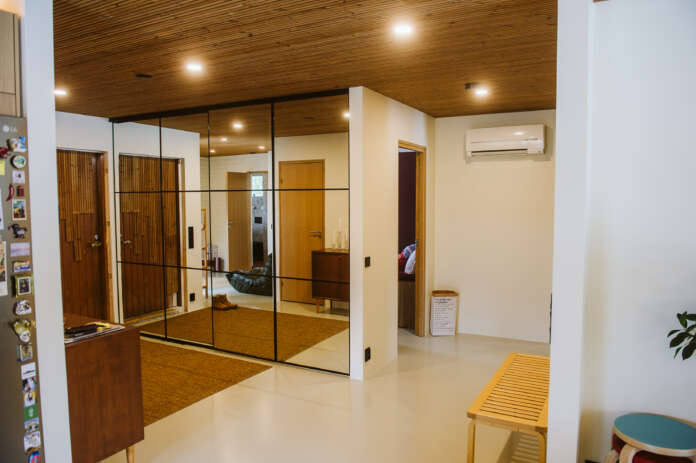 – Talossa oli kaksi aika isoa makuuhuonetta ja pitkä matka käytävää olohuoneesta ja eteisestä niiden luo. Käytävän osuutta lyhennettiin, jolloin saatiin lisätilaa eteiseen ja myös uusille makuuhuoneille. Näin melko pienestä 110-neliöisestä omakotitalosta saatiin aika kompakti ja tehokas kokonaisuus, puoliso kertoo.